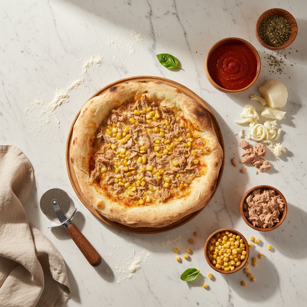 Thin crust pizza with tomato sauce, mozzarella, tuna, and sweet corn.