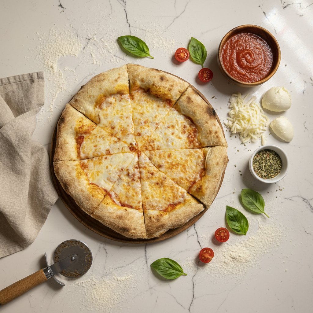 Thin crust pizza with tomato sauce, mozzarella cheese, and olive oil.