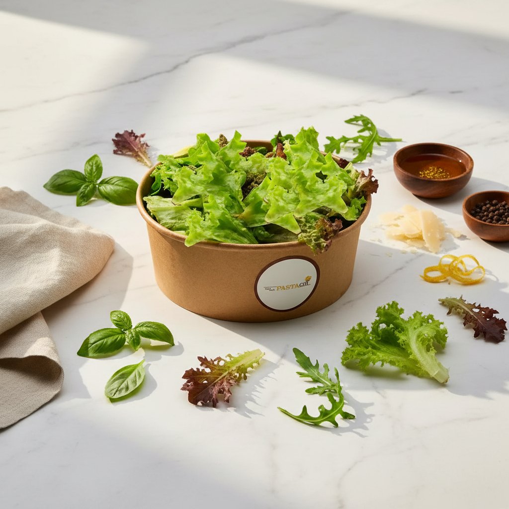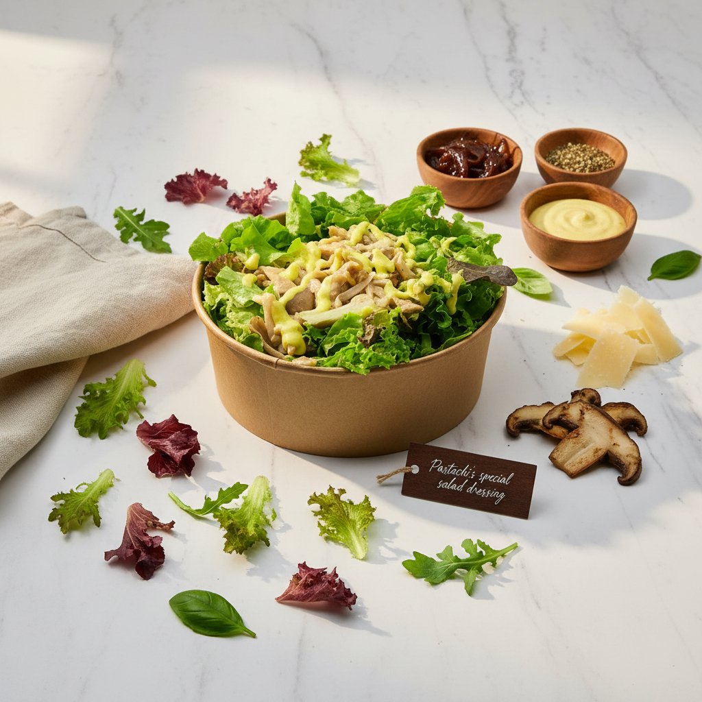 Fresh salad with Pastachi’s special dressing: lollo rosso, arugula, lettuce, basil, cherry tomatoes, and parmesan.