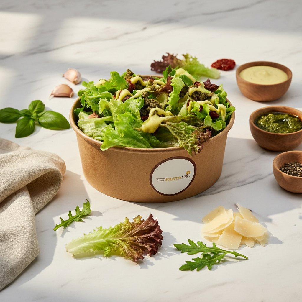 Fresh salad with Pastachi’s pesto sauce, sun-dried tomatoes, lollo rosso, arugula, lettuce, basil, cherry tomatoes, and parmesan.
