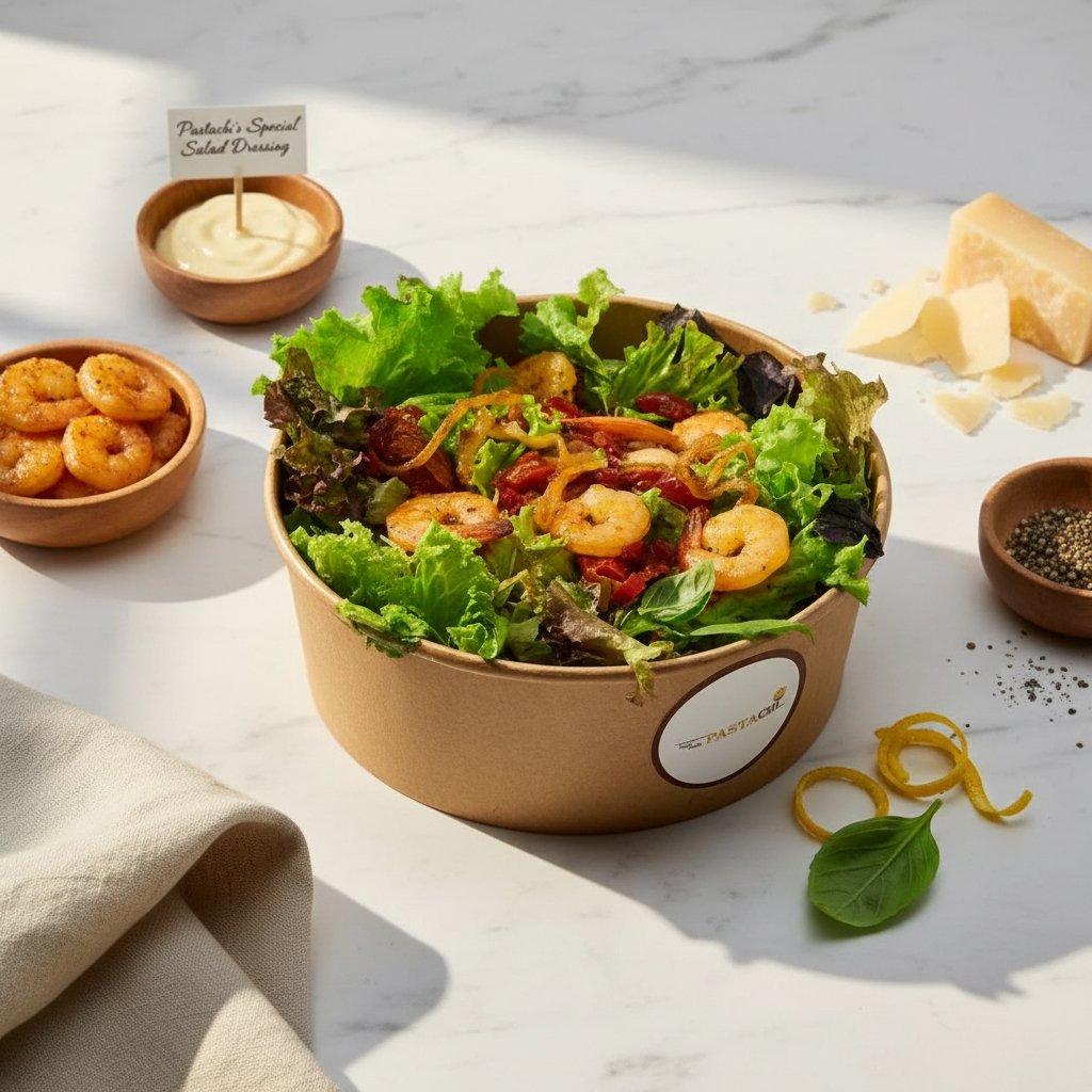 Fresh salad with tomato sauce, bell peppers, butter-sautéed shrimp, lollo rosso, arugula, lettuce, basil, cherry tomatoes, and parmesan.