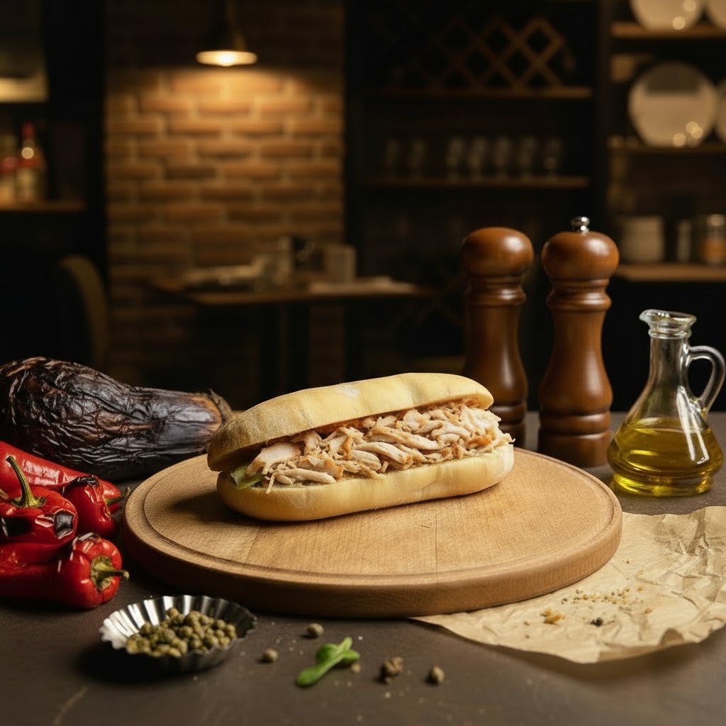 პასტაჩის სპეციალური პანინოს ცომი, მაიონეზი, თუნას თევზი, ხალაპენიოს წიწაკა, სალათის ფურცელი.