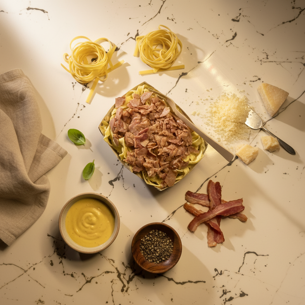 Pasta with special carbonara sauce. With minced beef, garlic, cream, Parmesan cheese, homemade Italian gourmet pasta (fettuccine) prepared in a wheel. The dough contains eggs.