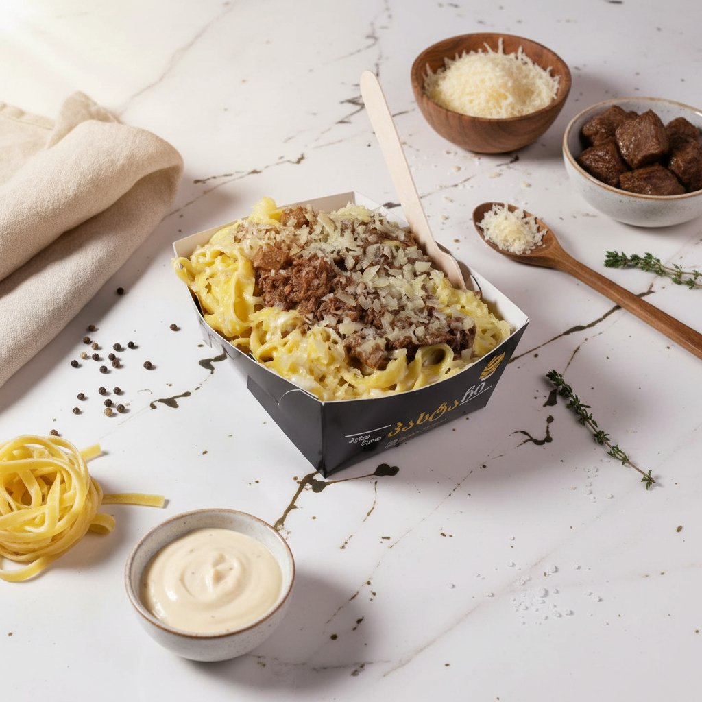 პასტაჩის სპეციალაური ბიფ ვეის სოუსი : მოხრაკული საქონლის ხორცი, ნაღებით .პარმეზანის ბორბალში მომზადებული ხელნაკეთი (ჰენდ მეით) იტალიური გურმანი პასტა (ფეტუჩინი) ცომი შეიცავს კვერცხს