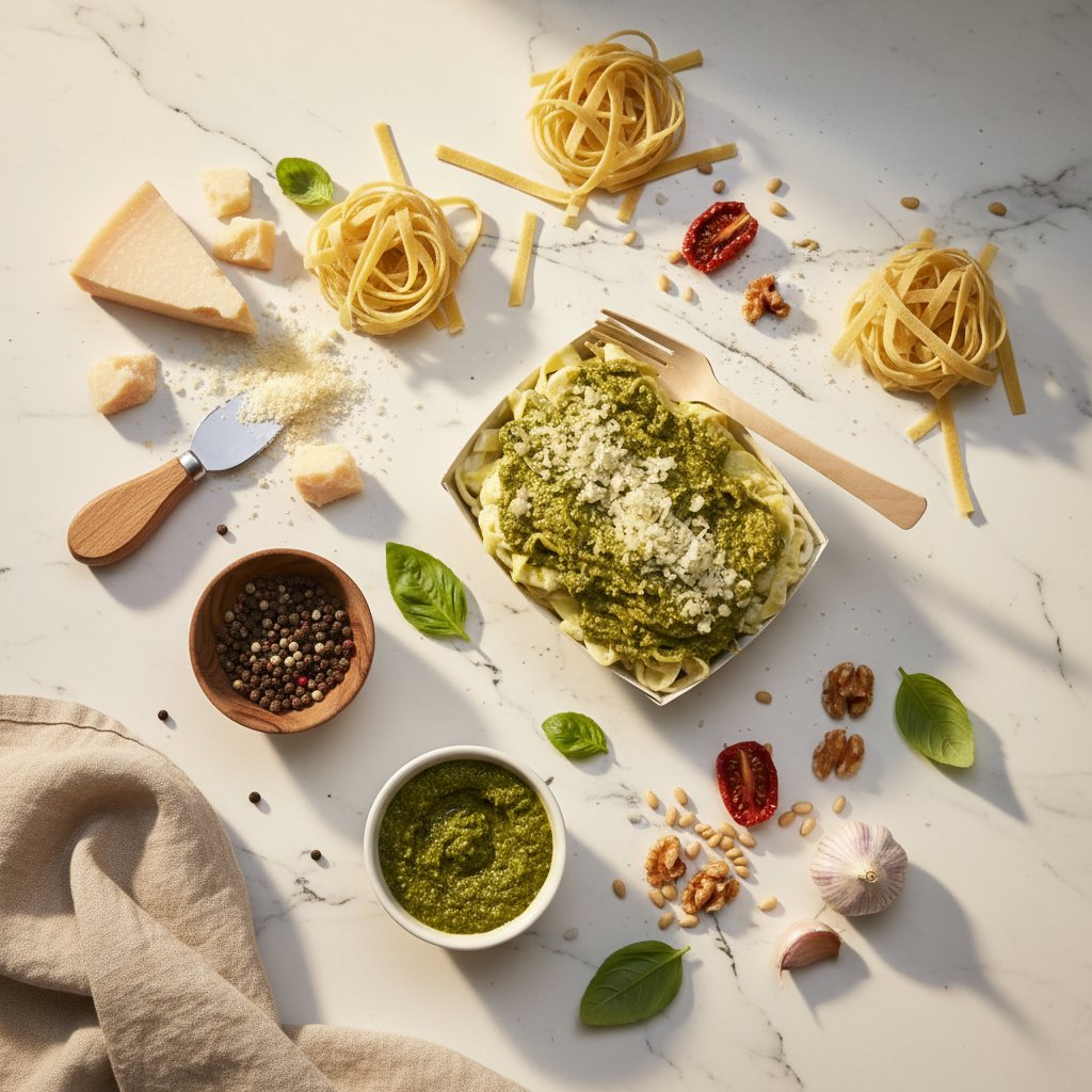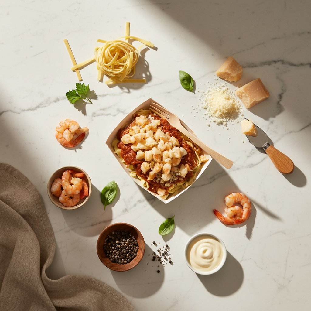 პასტაჩის სპეციალური ტომატის სოუსი: ბულგარულით, კარაქში მოხრაკული კრევეტებით , ნაღებით. პარმეზანის ბორბალში მომზადებული ხელნაკეთი (ჰენდ მეით) იტალიური გურმანი პასტა (ფეტუჩინი) . ცომი შეიცავს კვერცხს