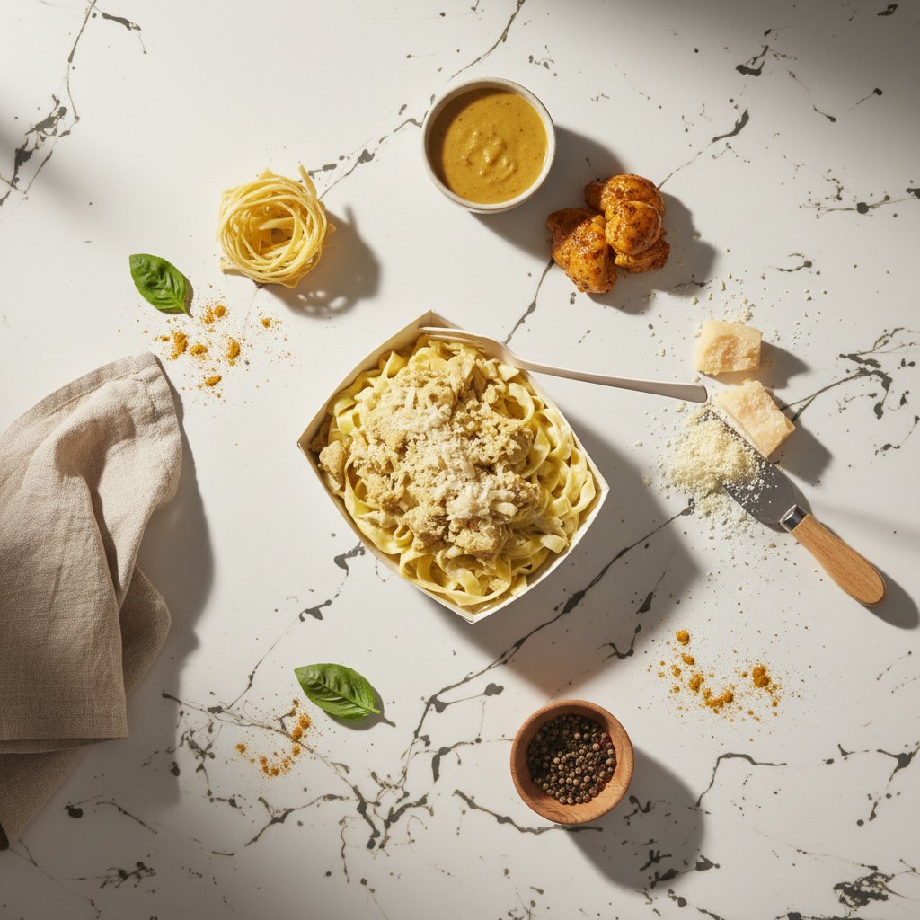 პასტაჩის სპეციალურ ქარის სოუსში მარინირებული ქათამი, ნაღებით პარმეზანის ბორბალში მომზადებული ხელნაკეთი (ჰენდ მეითი) იტალიური გურმანი პასტა (ფეტუჩინი) . ცომი შეიცავს კვერცხს