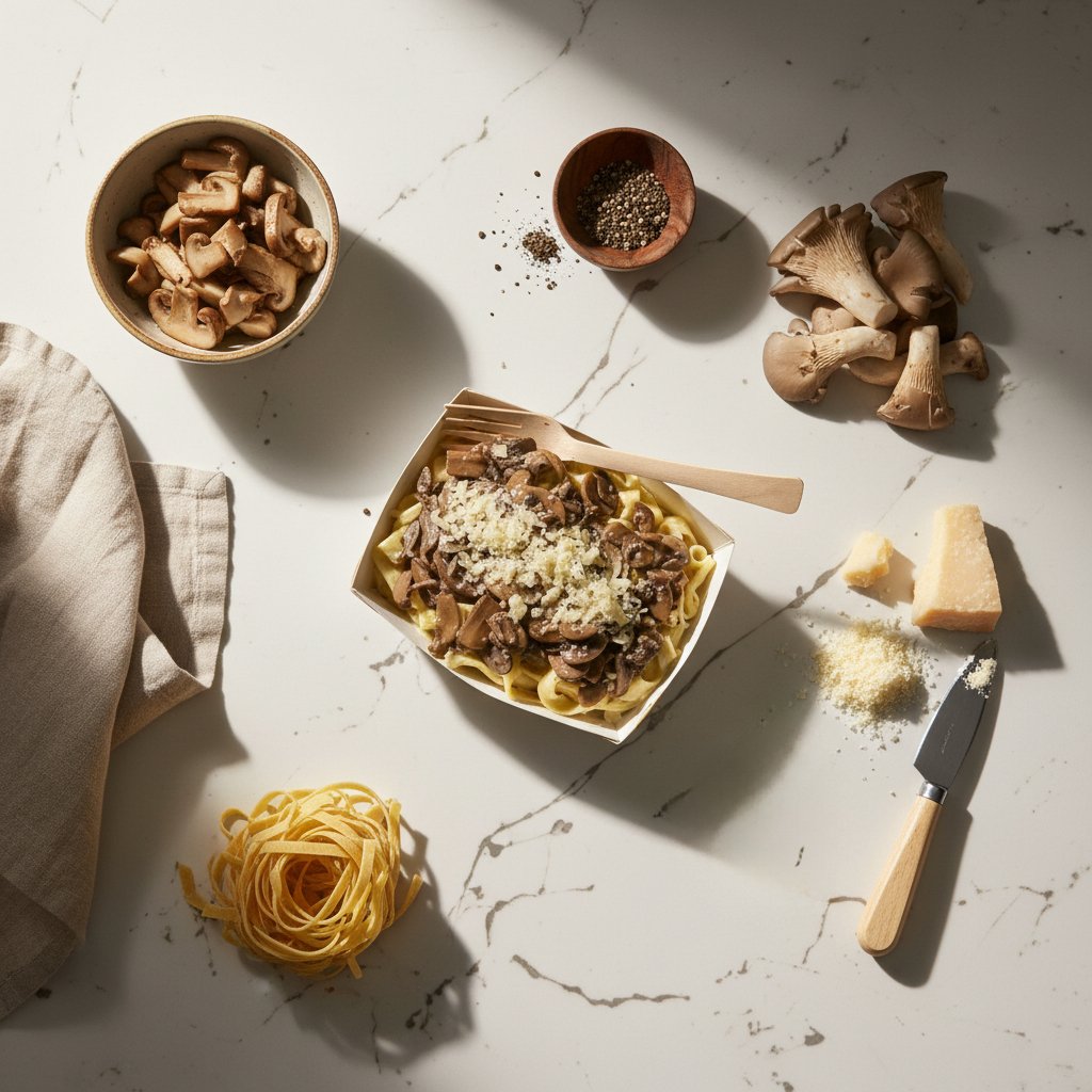პასტაჩის სპეციალური ქამა სოკოს და ხის სოკოს მიქსი, პარმეზანის ბორბალში მომზადებული ხელნაკთი (ჰენდ მეითი ) იტალიური გურმანი პასტა (ფეტუჩინი) ცომი შეიცავს კვერცხს
