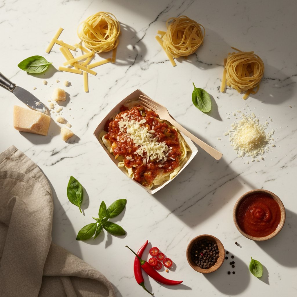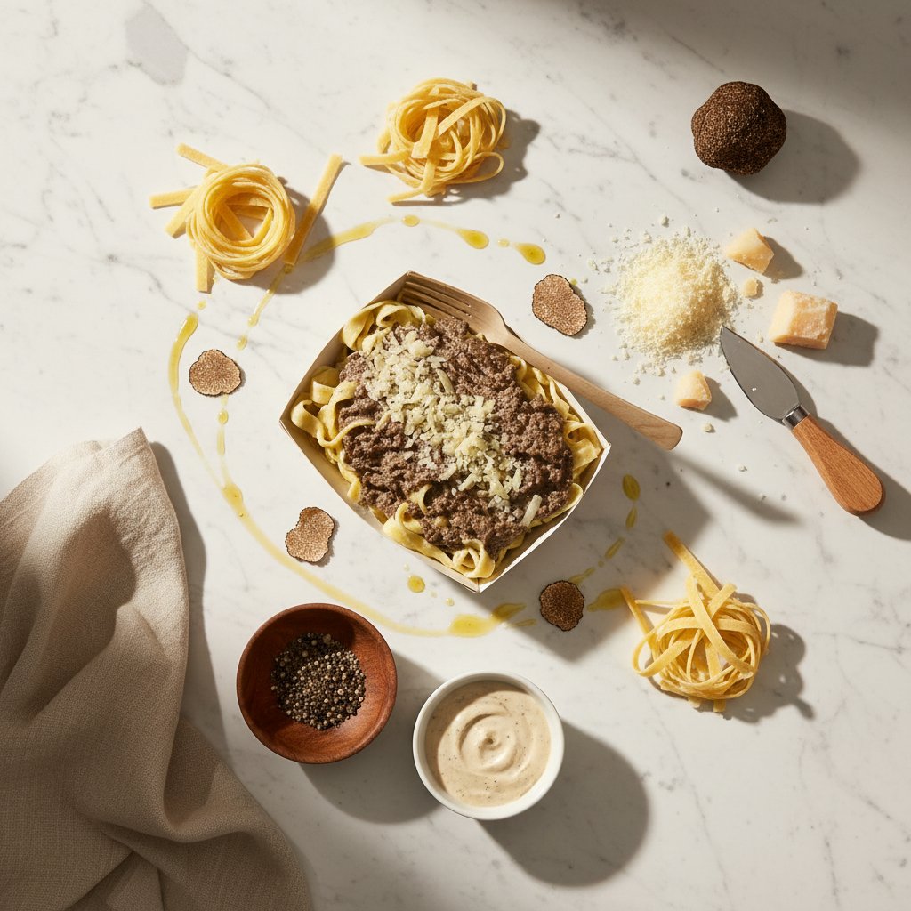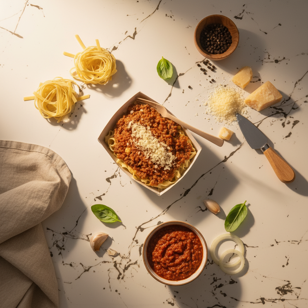 პასტაჩის სპეციალური ბოლონეზეს სოუსი , ტომატის სოუსში ფარშირებული საქონლის ხორცით , ნაღებით პარმეზანის ბორბალში მომზადებული ხელნაკეთი (ჰენდ მეითი) იტალიური გურმანი პასტა (ფეტუჩინი) ცომი შეიცავს კვერცხს