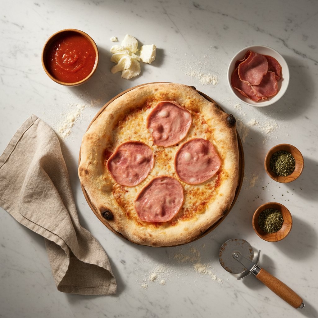პასტაჩის სპეციალური თხელი პიცის ცომით, პომიდვრის სოუსი, მოცარელას ყველი , შებოლილი საქონლის შაშხი, გამომშრალი პომიდორი