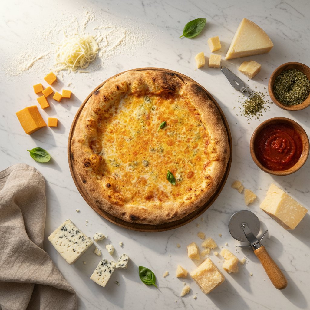 პასტაჩის სპეციალური თხელი პიცის ცომით, პომიდვრის სოუსი, მოცარელას ყველი , გორგონზოლას ყველი, ჩედარის ყველი, პარმეზანის ყველი