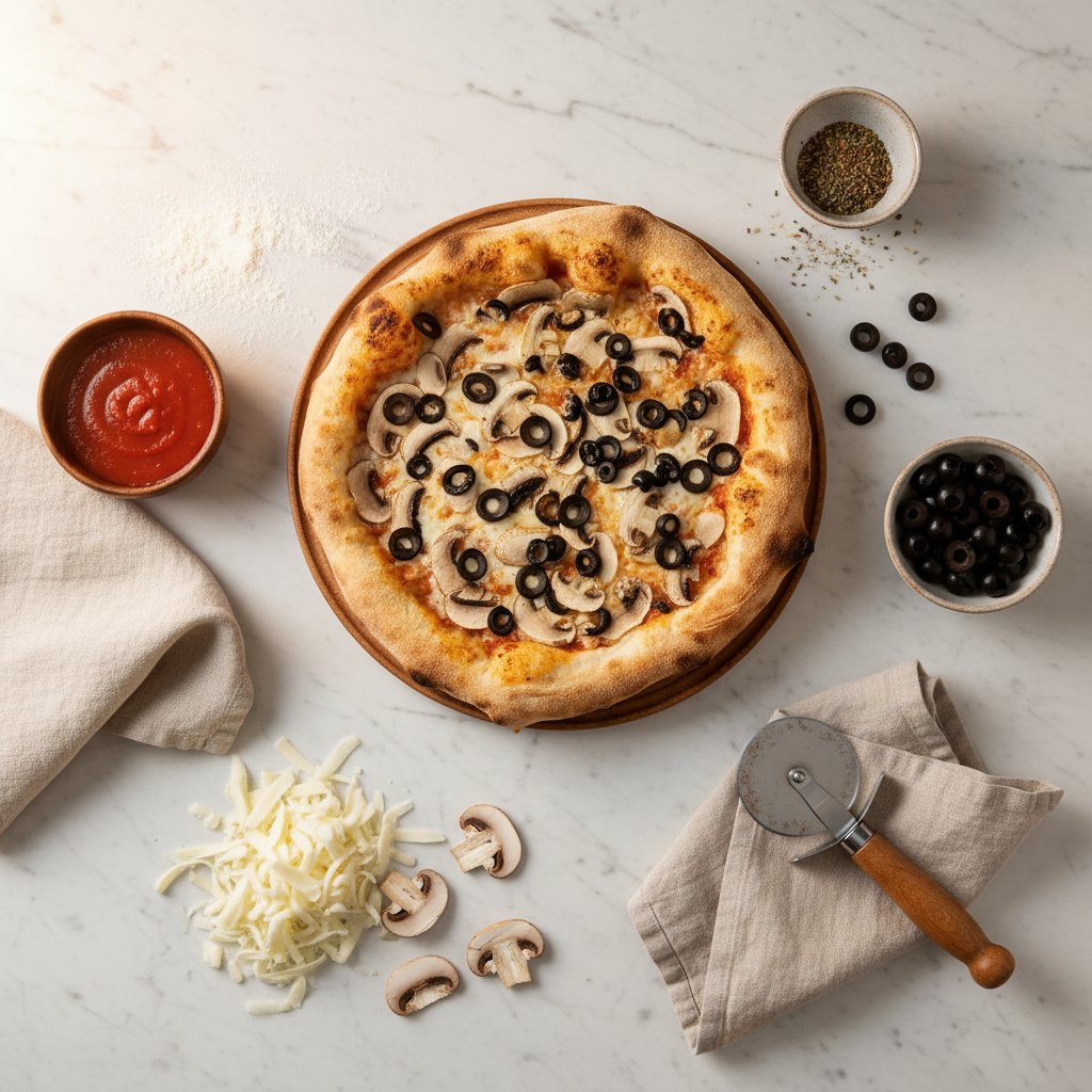 პასტაჩის სპეციალური თხელი პიცის ცომით, პომიდვრის სოუსი, მოცარელას ყველი, ქამა სოკო, შავი ზეითუნი